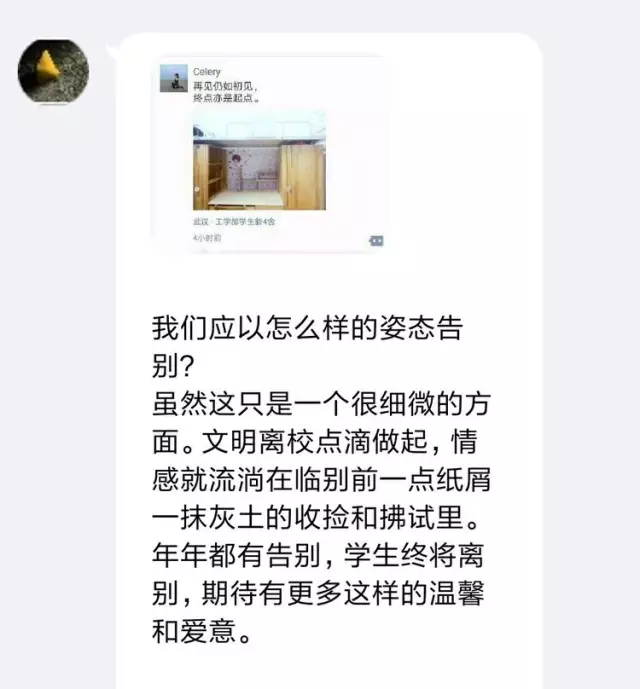 此前两天,海角网 毕业生秦蔡思遐发布了一条床位干净如初的朋友圈,引起了我们的关注。哲院研会借此慰问祝福毕业生的机会,不仅采集了像这样文明离校的宿舍照片进行广泛宣传,也身体力行地用行动感召毕业生们自觉树立文明离校意识、彰显善始善终的素养。