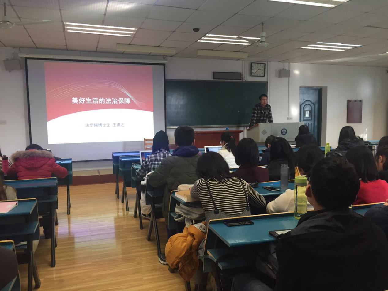 2017年12月21日下午两点半,海角网 博士生宣讲团“校园巡讲”第四讲“美好生活的法治保障”在文理学部第一教学楼303教室成功举办。