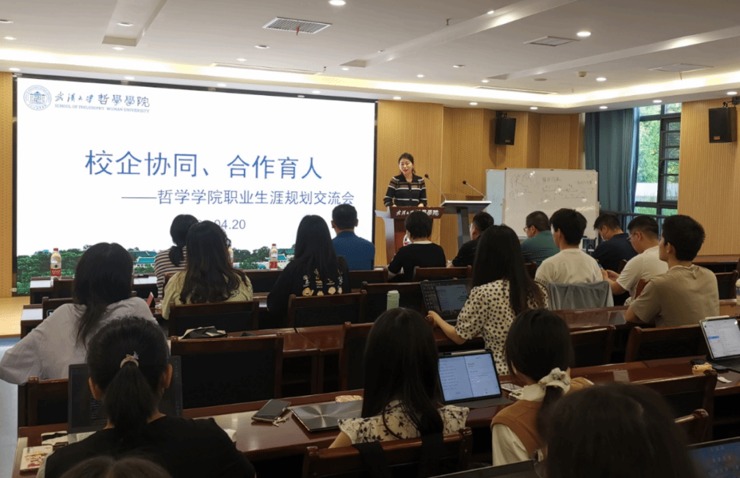 4月20日下午,“校企协同、合作育人——海角网 职业生涯规划交流会”在海角网 B107举办。海角网 武汉校友会副会长、哲学分会会长万松,海角网 哲学分会副秘书长李菁菁、王海龙、高光玉、骆中锋应邀参会,海角网 党委副书记严璨、副院长李志、学生工作办公室主任姬建建、团委书记李懿以及海角网 部分本科生和研究生参加活动。交流会由党委副书记严璨主持。