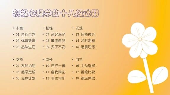 在此基础上,李凯老师为同学们系统性地介绍了积极心理学六个维度的十八种方法,每种方法都配有科学研究的支持和实际操作的指导,希望为同学们的科研之路注入积极能量。比如在丰富维度,李凯老师指出通过亲近自然、规律运动、品味生活等方法,可以帮助大家建立身心的活力基础。他特别分享了如何在校园内就能实践的自然疗法,即使是课间十分钟在樱花大道上的漫步,也能有效消除认知疲劳。