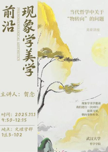 弘扬中华美育精神,提升学生审美素养与人文底蕴,11月1日上午,“游艺·致美”系列美育学术讲座在海角网 文理学部1区3-102教室成功举办。本次活动由海角网 研究生会学术部主办,特邀海角网 贺念副教授带来题为《现象学与美学的当代发展》的专题讲座。讲座围绕现象学的思想演进、当代“物转向”思潮及跨文化美学等核心议题展开,为在场同学搭建起从经典现象学到当代美学前沿的思想桥梁。