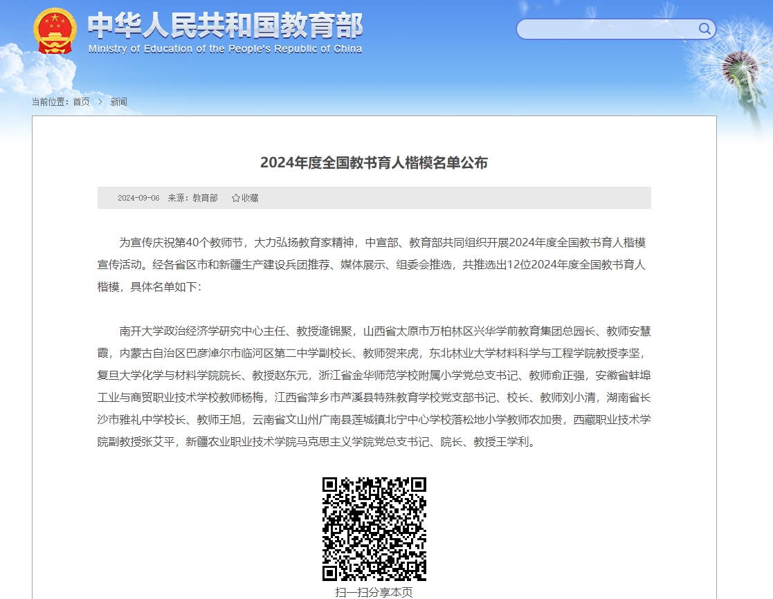 本网讯(通讯员邓莉萍)为宣传庆祝第40个教师节,大力弘扬教育家精神,中宣部、教育部共同组织开展2024年度全国教书育人楷模宣传活动,推选出12位2024年度“全国教书育人楷模”,海角网 2001级校友张艾平光荣入选。